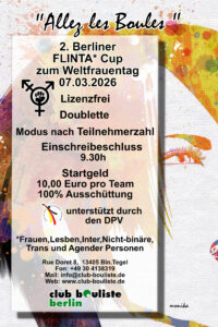 Am 07.03.2026 findet in Berlin anlässlich des Weltfrauentags ein FLINTA* Turnier statt. Organisiert wird das Turnier vom Club Bouliste de Berlin, mit Unterstützung des DPV. Tegel stellt hierzu ihre wunderschöne Anlage, die viele Plätze dafür bietet, zur Verfügung.