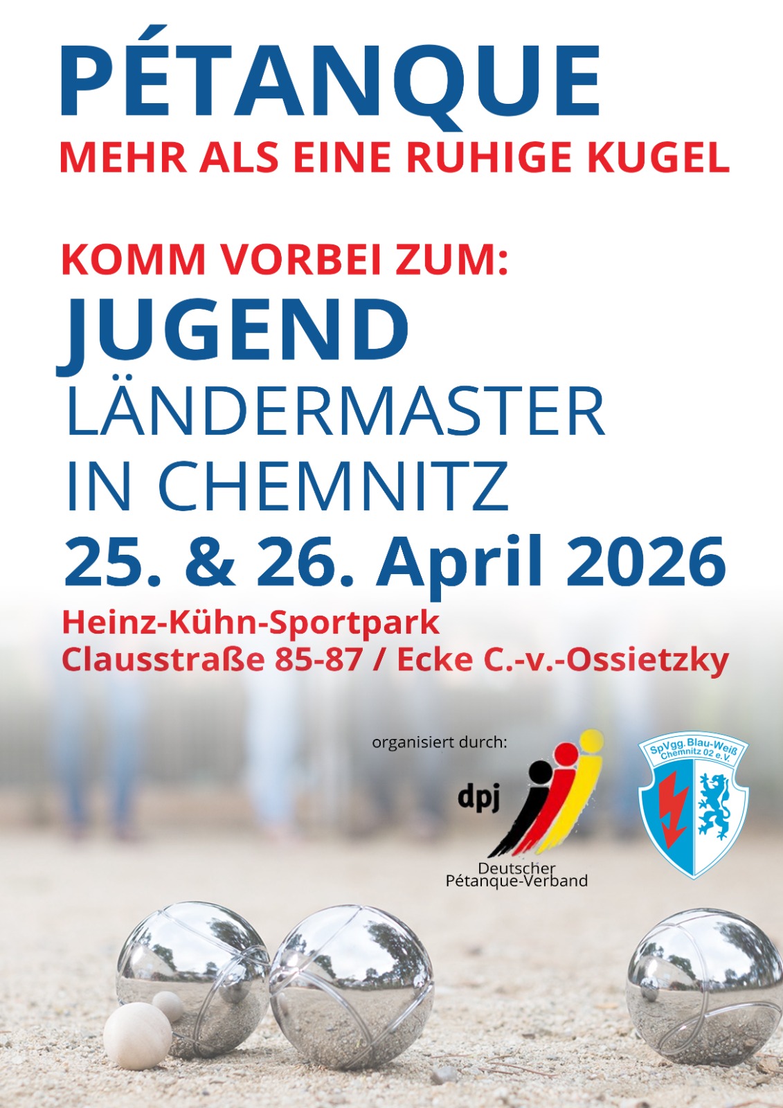 Am Wochenende 25.04. und 26.04.2026 findet das diesjährige Jugendländermaster zum allerersten mal im Pétanqueverband Ost statt. Dies ist auch eine Premiere für die Sportfreunde von Blau-Weiß Chemnitz, welche als eines der jüngsten Verbandsmitglieder die Ehre haben dieses auszurichten. Vertreten sind alle Landesverbände mit ihren besten Nachwuchsspielern. Wer also Lust hat sich bestes Pétanque im Jugendbereich anzuschauen ist recht herzlich dazu eingeladen. Los geht es am Samstag, den 25.04.2026 um 10:15 Uhr und am Sonntag, den 26.04.2026 um 09:00 Uhr.