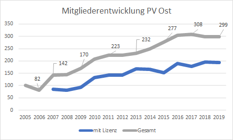Die Entwicklung der Mitgliedszahlen im PV Ost. Von den 299 Personen sind 97 Frauen und 202 Männer. Der Anteil der unter 18jährigen Spieler beträgt sieben Prozent.Gemütlich war’s beim diesjährigen Verbandstag in den angestammten Räumen in Chemnitz: 20 Delegierte aus den PV Ost-Vereinen fanden sich ein, um einen neuen Vorstand zu wählen und die Termine der 2020er Saison zu planen. Keine Überraschungen gab es an der Verbandsspitze – auch für die nächsten zwei Jahre werden Heiko Kastner, Alex Conrad, Diana Hellriegel, Bastian Pelz, Detlef Schwede, Stephan Weigel und Sabine Friedel die Geschicke des PV Ost in den Händen halten. Ein klein wenig lichter wurde es im Turnierkalender, sowohl Reichenbach als auch Jena kommen von ihrem Doppelturnier ab und die Dresdner Coppa wurde nicht terminiert – dafür wird in Jena endlich wieder einmal ein Liga-Spieltag stattfinden. Die leicht reduzierten Turniertermine spiegeln auch ein wenig die Entwicklung der letzten Jahre wieder: Obgleich die Mitgliederzahlen im PV Ost stabil geblieben sind (299 Boulefreundinnen und Boulefreunde, davon 193 mit Lizenz), hat vor allem die hohe Geburtenrate zu einer leichten Dezimierung der aktiven Turnierteilnehmer beigetragen. Zufrieden macht nach wie vor die sportliche Entwicklung, dank zahlreicher Startplatzholer hat der PV Ost neben den 11 Quantitätsstartplätzen bei Deutschen Meisterschaften im Jahr 2020 noch 9 Qualitätsstartplätze dazu erspielt (2019: 8, 2018: 7). Mit goldenen Ehrennadeln für Stephan Weigel und Frank Haase und Ranglistenprämierungen für Jens Riedel, Fethi Aouissi und Stefan Lauche fand der Verbandstag trotz ausgiebiger Hofpause schon 13:10 Uhr sein harmonisches Ende (neue Rekordzeit!). Danke an alle Anwesenden für die konstruktive Mitwirkung. Das Protokoll wird nach Fertigstellung dann im Bereich Verbandstag 2020 veröffentlicht. Die Terminplanung für die Saison findet Ihr hier auf dieser Seite unter Turniere 2020, LMs 2020 und im Turnierkalender 2020.