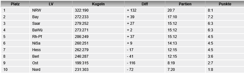 Es bleibt aber festhalten, dass der PV Ost auch gegen andere Verbände durchaus seinen Stempel aufdrücken konnte – wenn auch nur mit einzelnen Nadelstichen. So gewann etwa 55+ in Runde 1 gegen Rheinland-Pfalz, während die anderen Teams unterlagen, knapp mit 12:13 die einen (65+), hoffnungslos mit 0:13 die anderen (Damen).