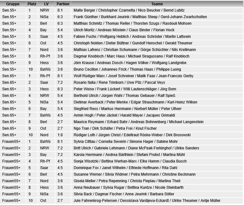 In der Besetzung des Teams 65+ war hingegen nur Ngo Tran im Vergleich zum letzten Jahr übrig geblieben, allerdings waren zwei weitere Bestandteile dennoch schon länderpokalerfahren: Petra Frei bei den Frauen und Knut Fischer bei den 55+-Männern. Als einziger echter Neuling hinzu kam Dirk Schäfer aus Schönebeck.