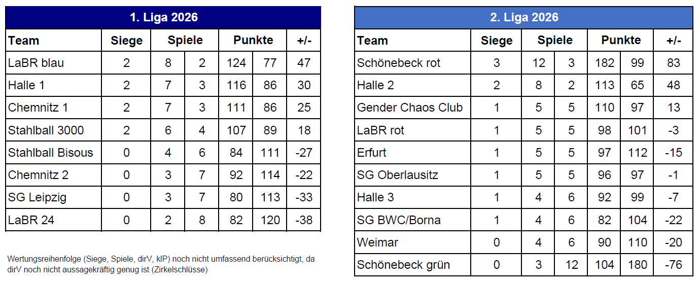 Bei einem wunderbaren Sonne-Wolken-Mix (mit einer kleinen Tröpfeleinlage) wurde am vergangenen Sonnabend die Liga-Saison des PV Ost eröffnet. 18 Mannschaften trafen sich im Schönebecker Sportforum – ein Gelände, das wie kaum ein zweites im PV Ost ideal für einen Liga-Spieltag geeignet ist und für lange Anfahrtswege mit schönen Camping-Möglichkeiten entschädigt. Als Hauptschiedsrichterin fungierte Regina Stehr, die somit gleich vom Anwärter- in den Profistatus wechseln konnte. Nach der Eröffnung durch den Präsidenten und der Ranglistenprämierung für die vergangene Saison konnten die Spiele starten. Gemütliche zwei Begegnungen waren zu absolvieren – und obgleich sich alle Mannschaften um einen zügigen Ablauf bemühten, nahm die eine oder andere spannende Entscheidungspartie so viel Zeit in Anspruch, dass die letzten Spieler erst abends um sieben den Platz verließen. Die Tabellen sind noch nicht wirklich aussagekräftig. In der ersten Liga teilt sich das Feld in vier Teams mit zwei und vier Teams mit null Siegen. In der zweiten Liga haben die Schönebecker bereits ihre Lokalpartie absolviert und daher fünf Spiele mehr auf dem Zähler. Der nächste Liga-Spieltag findet am 30. Mai um 10:00 Uhr in Dresden statt. Hier stehen dann in beiden Ligen drei Begegnungen auf dem Plan, so dass mit einem langen Tag zu rechnen ist. Alle Ergebnisse gibt’s wie immer auf den Liga-Seiten.